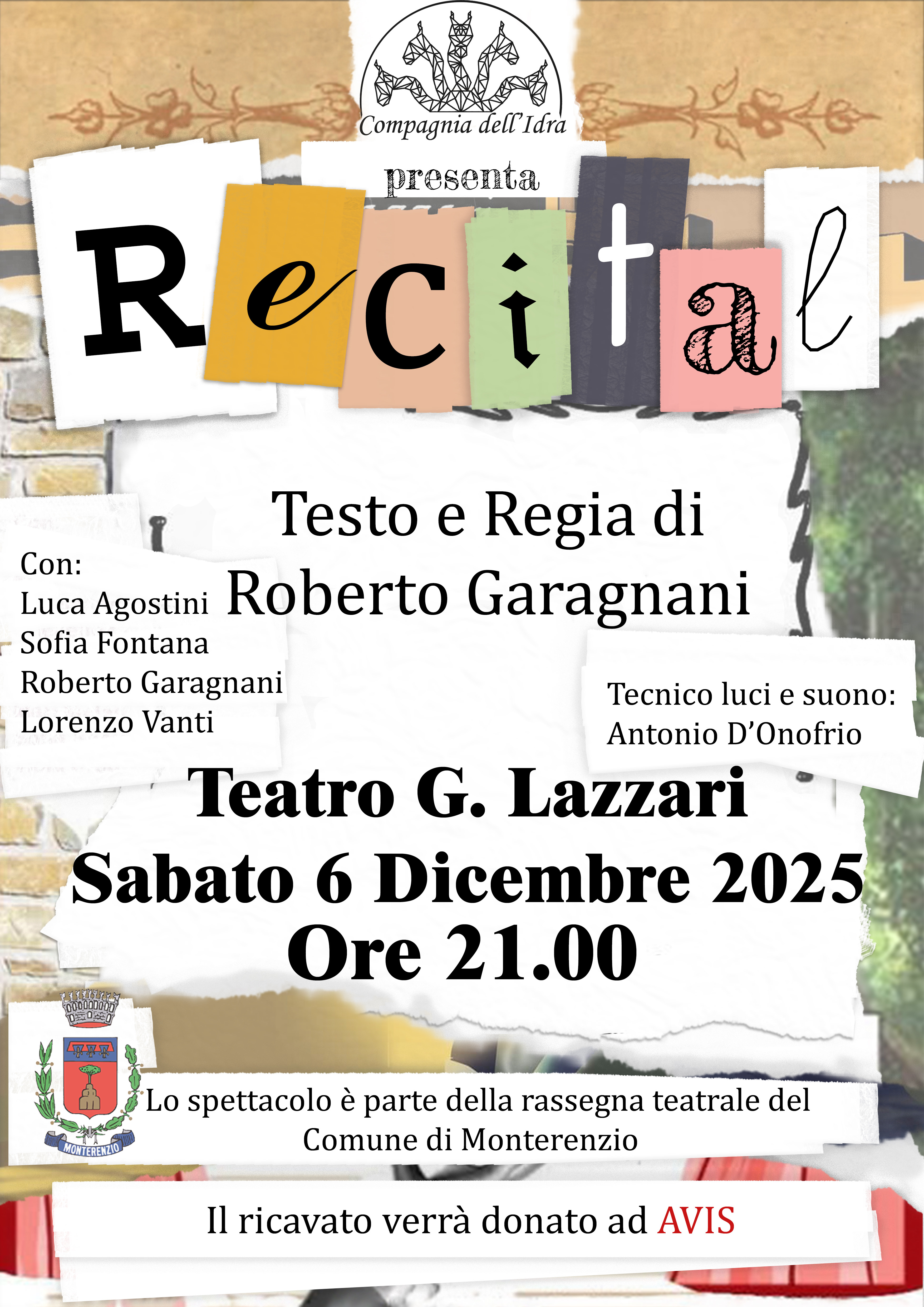 Sabato 6 dicembre 2025 alle ore 21.00 presso il Teatro G. Lazzari, andrà in scena “Recital”, scritto e diretto da Roberto Garagnani e proposto all’interno della rassegna teatrale promossa dal Comune di Monterenzio.
