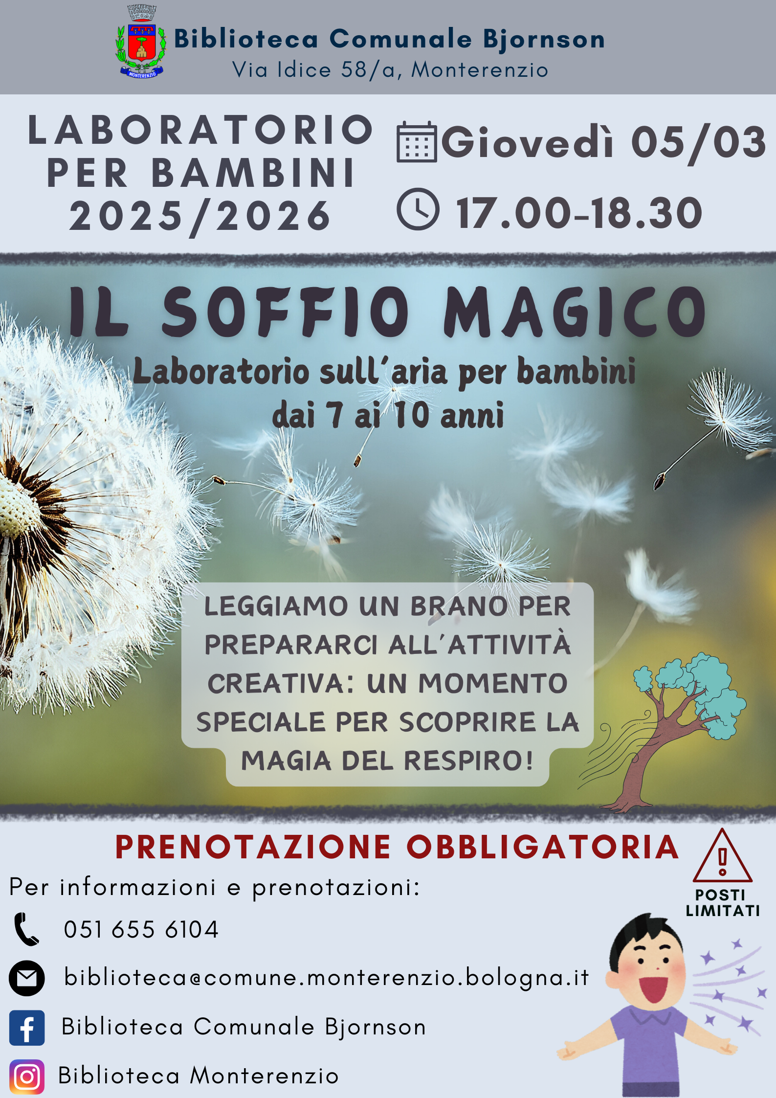 Giovedì 5 marzo 2026 vi aspettiamo dalle 17 alle 18:30 in biblioteca per il laboratorio dedicato ai bambini dai 7 ai 10 anni. Il tema sarà l'elemento dell'aria: il respiro.