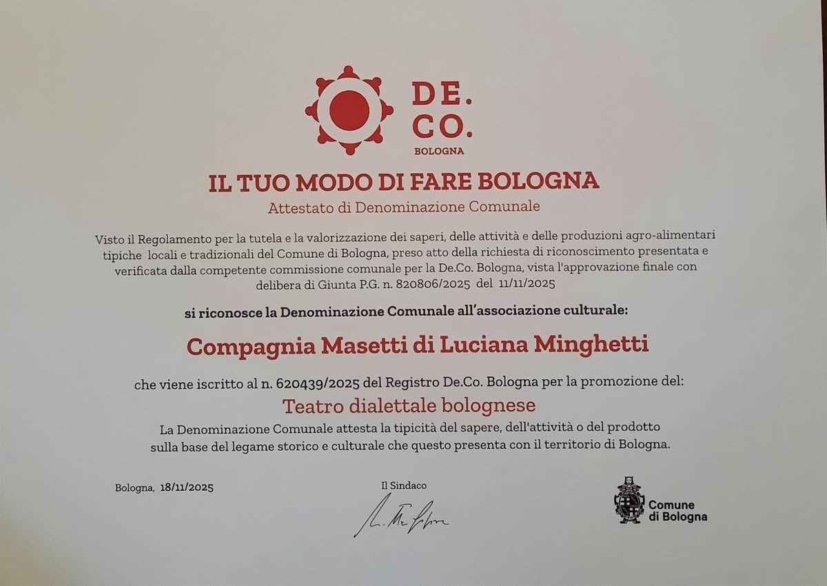 Il Comune di Monterenzio si congratula con la Compagnia Masetti di Luciana Minghetti per l’importante riconoscimento ottenuto con l’iscrizione al registro De.Co. Bologna – Denominazione Comunale, per la salvaguardia e la valorizzazione del teatro dialettale bolognese.