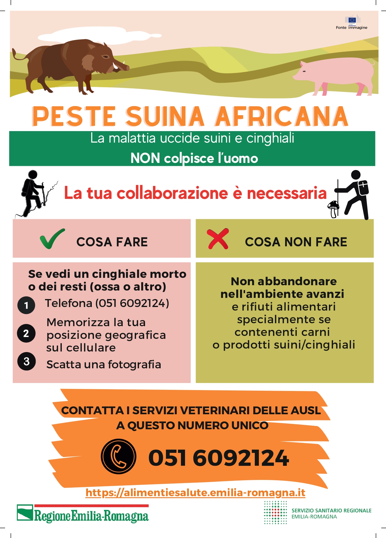 • Se vedi un cinghiale morto o resti (ossa, carcasse) memorizza la posizione sul cellulare in modo da poterla comunicare all’operatore e scatta una fotografia della carcassa: contatta immediatamente i Servizi Veterinari AUSL al numero unico 051 6092124 attivo 24 ore su 24 7 giorni su 7.