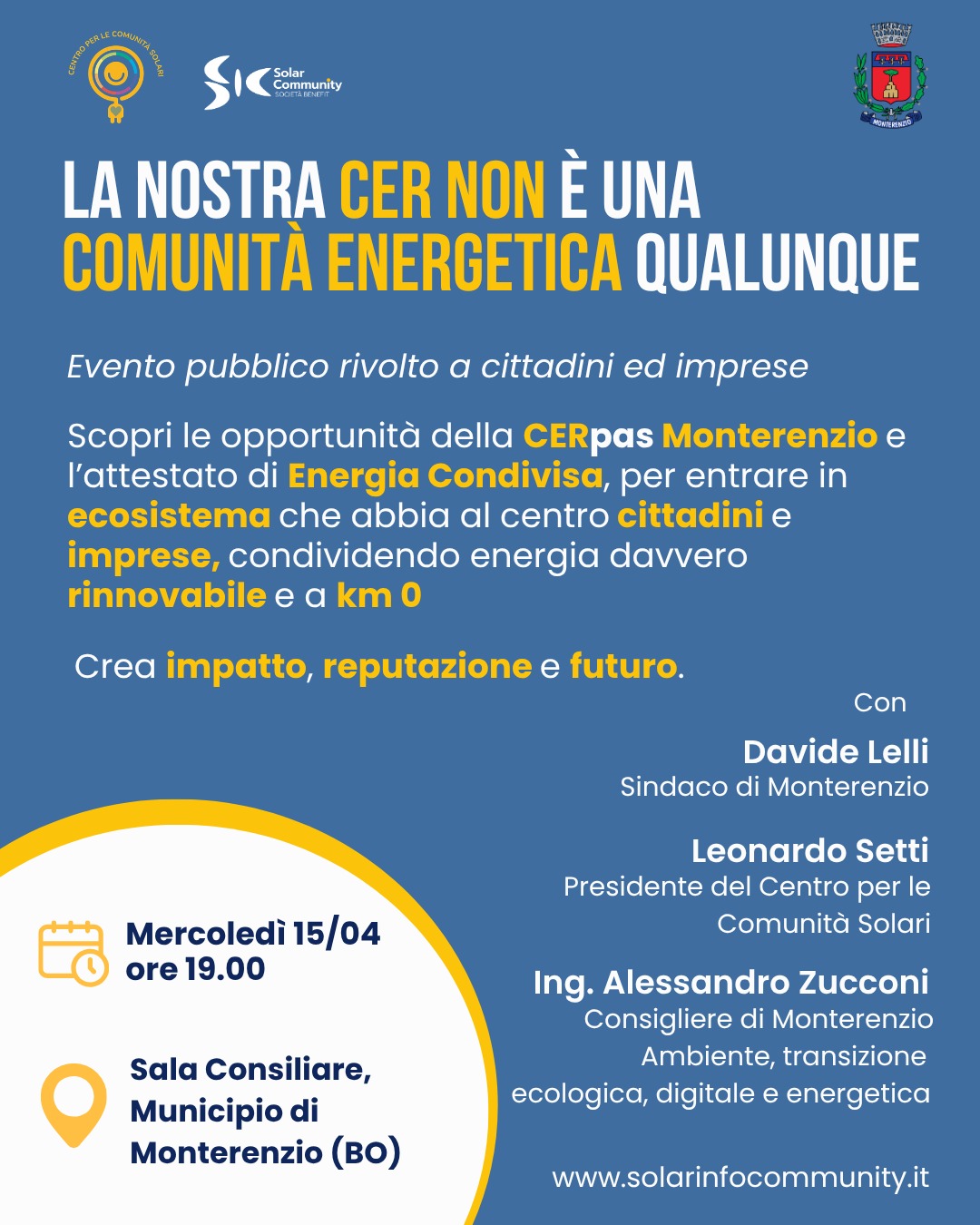 Mercoledì 15 aprile alle ore 19.00, presso la Sala Consiliare del Municipio di Monterenzio, si terrà un incontro rivolto a cittadini e imprese per approfondire le opportunità offerte dalla CERpas Monterenzio e dall’attestato di Energia Condivisa.