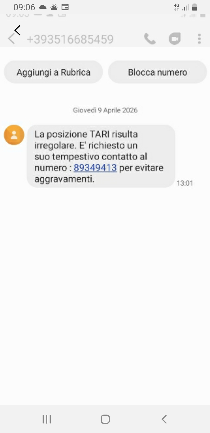 Se ricevete un sms sul telefonino che vi invita a contattare un numero di telefono per presunte irregolarità nella tassa rifiuti (TARI), non consideratelo